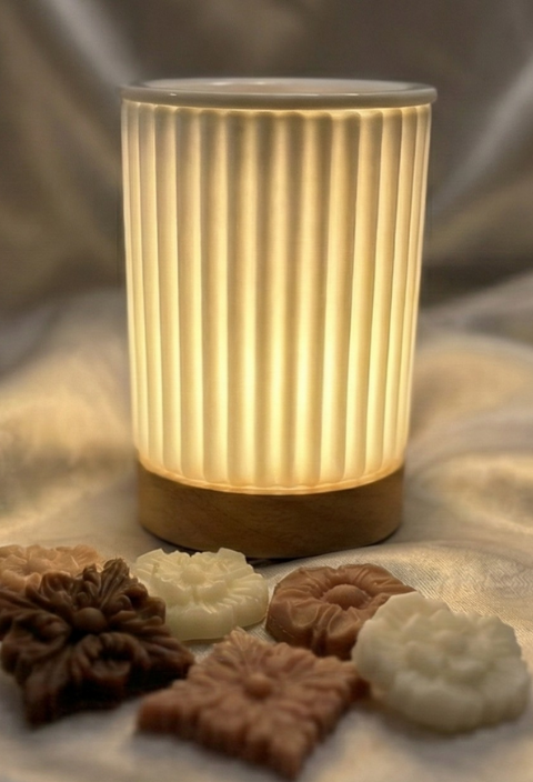 This Minimal Ceramic Electric Wax Melts Warmer combines minimalist aesthetics with Timer & Dimmer Fuction. The matte white ceramic shade paired with a warm wooden base creates a natural, balanced look, while the soft halogen light adds a visual layer of tranquility to your olfactory experience.
